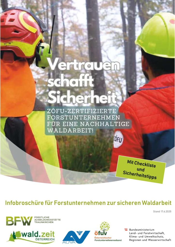 Das Gütesiegel ZÖFU (Zertifiziertes Österreichisches ForstUnternehmen) hat mit dem Verein wald.zeit mit Unterstützung des Österreichischen Forstunternehmerverband, sowie dem Bundesministerium für Land- & Forstwirtschaft eine Informations-Broschüre zur sicheren Waldarbeit herausgegeben. Die Broschüre steht digital unter www.zöfu.at allen Forstunternehmen, Waldbewirtschaftern und Waldinteressierten zur Verfügung.